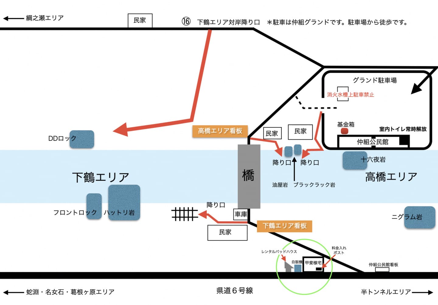 県道6号線、及びエリアまでの全ての道路は、地元車優先です。